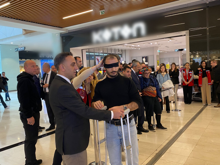 Aile ve Sosyal Hizmetler Bakanlığı Edirne İl Müdürlüğü, 3 Aralık Dünya Engelliler Günü dolayısıyla farkındalık yaratmak amacıyla bir alışveriş merkezinde dikkat çekici bir etkinlik düzenledi. Vatandaşlara yönelik gerçekleştirilen etkinlikte, tekerlekli sandalye, yürüme bandı ve koltuk değneği gibi ekipmanlar kullanılarak katılımcıların empati yapmaları sağlandı.