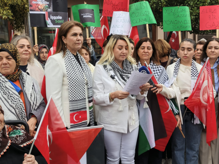 Bizler de ablukayı delmek ve insanlık onurunu korumak için mücadele eden kahramanların ülkemize dönüşlerinde oradaydık. Hepsinin dilinde aynı temenni vardı; 'Biz elimizden geleni yaptık, umarım Gazze’ye bir umut ışığı olabilmişizdir.' İşte bugün o umut sözleri de bu meydanda yankılanıyor. Nehirden denize özgür Filistin. Biz bugün bütün kimliklerimizden sıyrılarak; sadece kadın kimliğimizle buradayız. Çünkü bu mesele ne dünyadaki rollerimizle ne taşıdığımız unvanlarla ne de sahip olduklarımızla ilgilidir; bu mesele insanlık meselesidir. Bugün Türkiye’den tüm dünyaya tek bir şey söylüyoruz; barış kadınla mümkündür. Slogan atmıyoruz; vicdanlarımızla haykırıyoruz. Çünkü bazı sessizlikler vardır ki, arşı yere indirir. Ve bizim sessizliğimiz, Gazze’nin en gür çığlığı olacaktır. Ve şimdi, sizleri de sessiz çığlık zincirimize davet ediyorum" diye konuştu. Açıklamanın ardından tüm katılımcılar sessiz çığlık zinciri oluşturdular.