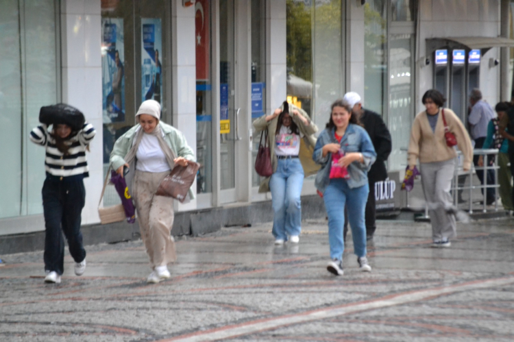 Saraçlar Caddesi’nde yağmura yakalanan vatandaşlar, şemsiyeler ve montları ile korunmaya çalışırken; yağışın şiddetini artırmasıyla birlikte caddedeki dükkanlara sığındı.