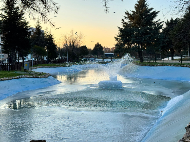 Edirne’de gece saatlerinde -5 dereceye kadar düşen hava sıcaklığı, kentteki su birikintilerini ve süs havuzlarını dondurdu. Barış Parkı içerisinde bulunan suni göletin yüzeyi tamamen buz tuttu. fıskiyelerden akan sular, dondurucu ayazın etkisiyle buz sarkıtlarına dönüştü. Ortaya çıkan bu manzara soğuğun şiddetini gözler önüne seriyor.