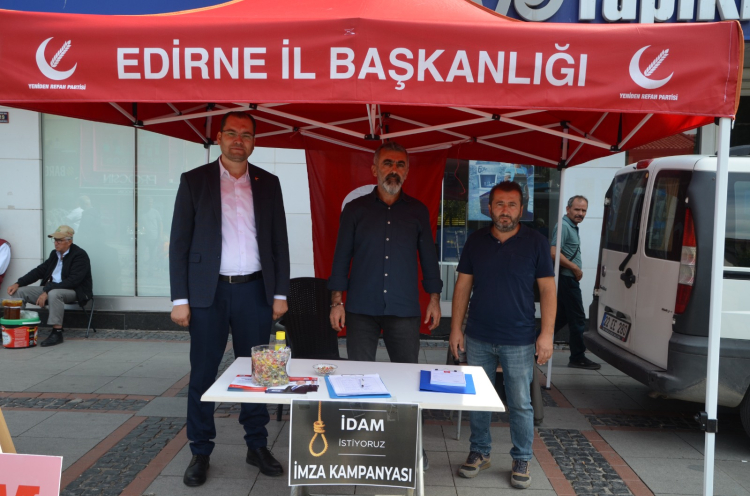 Yeniden Refah Partisi (YRP) Edirne İl Başkanlığı tarafından idam cezası taleplerine destek vermek amacıyla Edirne’nin Saraçlar Caddesi’nde imza kampanyası başlatıldı.