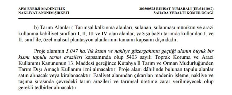 Projenin tanıtım dosyasında verilen bilgilerde ayrıca ilginç bir detay dikkat çekti. Dosyada, proje alanının 5,047 hektarlık kısmı ve nakliye güzergahının geçtiği alanın büyük bir kısmının tapulu tarım arazileri kapsamında olduğu belirtilirken; 5403 sayılı Toprak Koruma ve Arazi Kullanımı Kanunu’nun 13. maddesi gereği Kütahya İl Tarım ve Orman Müdürlüğü’nden tarım dışı amaçlı kullanım izni alınacağına yer verildi.