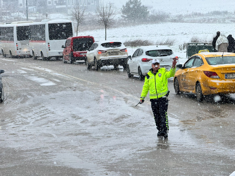 Özellikle kayganlaşan zemin nedeniyle pek çok noktada maddi hasarlı kazalar meydana gelirken, kavşaklarda uzun araç kuyrukları oluştu.