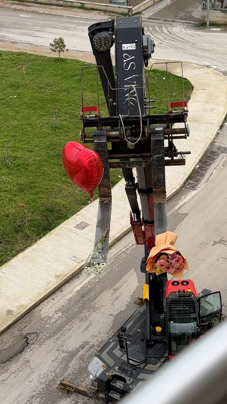 14 Şubat Sevgililer Günü’nü unutan kepçe operatörü Sefa Kurt, eşinin gönlünü almak için manitou denilen iş makinesinin ucuna bağladığı gül buketi ve balonu evlerinin balkonuna uzattı. Kepçeyle yapılan romantik sürpriz, hem Kurt'un eşini hem de çevredeki vatandaşları şaşırttı.