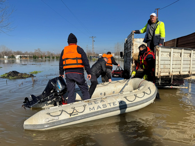 Bosna köyü yolunda suların sokaklarda insan boyuna ulaşması üzerine ulaşımın imkansız hale geldiği çiftliklerde mahsur kalan AFAD ekipleri tarafından botlarla güvenli alanlara taşınıyor.