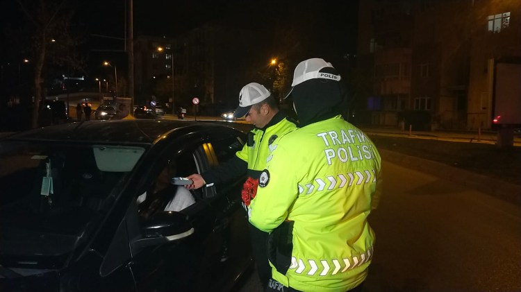 Denetimde araç sürücülerinin evrakları kontrol edilirken bir diğer yandan da kadın sürücülere 8 Mart Dünya Kadınlar Günü çerçevesinde karanfil hediye edildi.