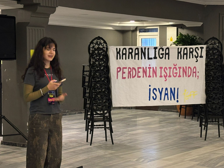 Sansürsüz bir festival gerçekleştirdiklerini belirten Hüyük “Biz de bugün, biletsiz, sponsorsuz ve sansürsüz bir festival gerçekleştirerek; özgürlüğümüzü kısıtlayan, sesimizi bastırmaya çalışan bu düzene karşı sanatımızla ve birlikte eğlenerek isyan ediyoruz. Umuyorum ki, yaşarken yalnız hissettiğimiz duyguları perdede görmek, bu mücadelede aslında yalnız olmadığımızı bize hatırlatır. Ya da hep birlikte söylediğimiz bir şarkı, günlerce dilimize dolanır ve bize umut olur” dedi.