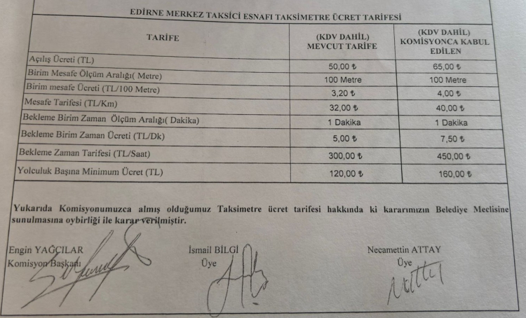 Edirne’de taksici esnafının artan maliyetler nedeniyle talep ettiği zam, mart ayı belediye meclisi toplantısında oy birliğiyle kabul edildi.