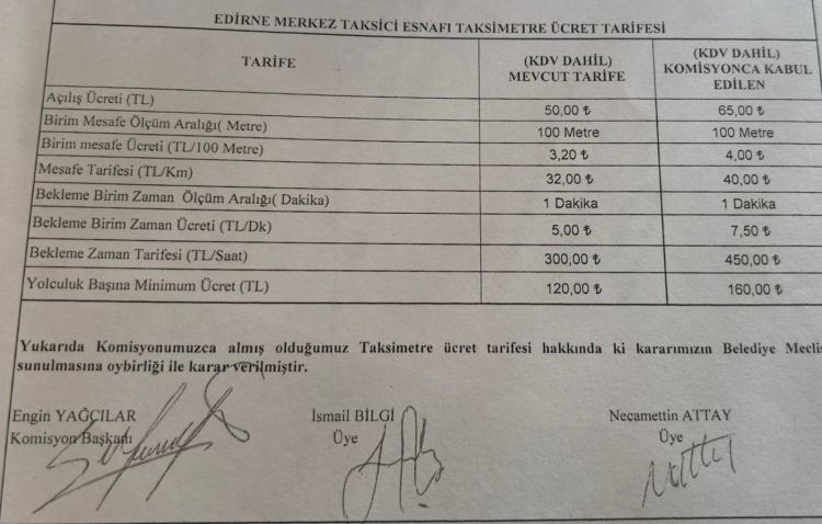 Edirne Belediye Meclisi’nin mart ayı toplantısında alınan karar doğrultusunda taksi ücretlerine yapılan zam bugünden itibaren uygulanmaya başlandı. Artan maliyetler nedeniyle taksici esnafının talep ettiği fiyat düzenlemesi sonrası yeni tarife yürürlüğe girdi.