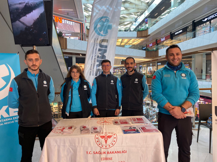 Edirne İl Sağlık Müdürlüğü’ne bağlı Ulusal Medikal Kurtarma Ekibi (UMKE), kentteki bir alışveriş merkezinde stant açarak vatandaşlara acil durumlarda yapılması gerekenlerle ilgili bilgilendirme yaptı.
