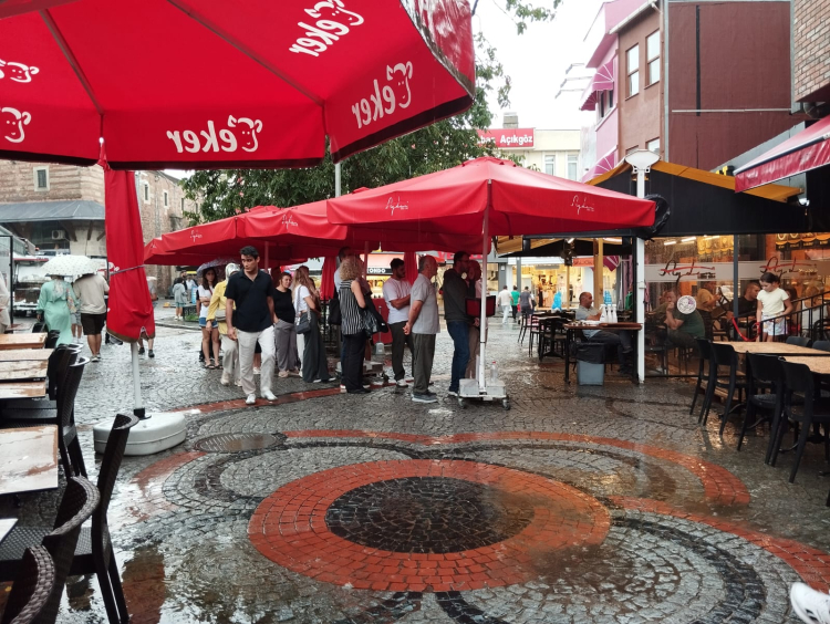 Edirne’de bugün öğlene yakın saatlerde başlayan yağmur etkisini devam ettiriyor. Çarşı merkezinde vatandaşlar yağmurun etkisinden korunmaya çalışırken bir Edirne tava ciğeri işletmesinin önündeki kuyruk dikkat çekti.