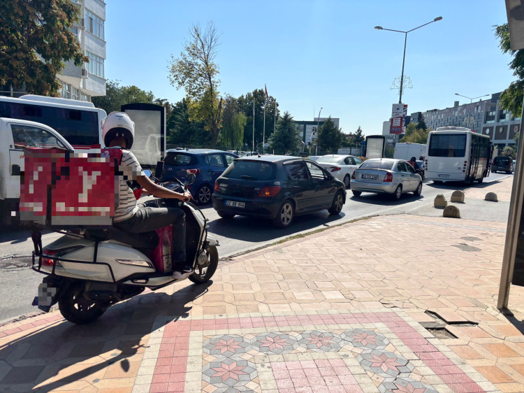 Edirne’de okulların açılmasıyla birlikte kent merkezindeki trafik yoğunluğu arttı. Trafikte zaman kaybetmek istemeyen bazı motosiklet sürücüleri ise yayalara ait kaldırımları kullanmaya başladı.