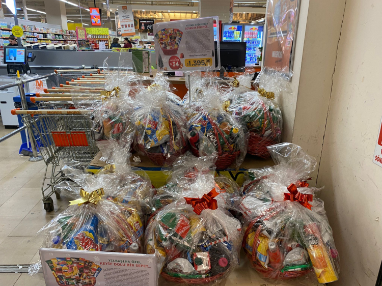 Edirne’de bir marketin yılbaşına özel hazırladığı hediye sepetleri, beklenen ilgiyi görmedi. Yılbaşı öncesinde satışa sunulan ve çeşitli ürünlerden oluşan sepetler, yeni yılın üzerinden günler geçmesine rağmen satılmadı ve raflarda kaldı.