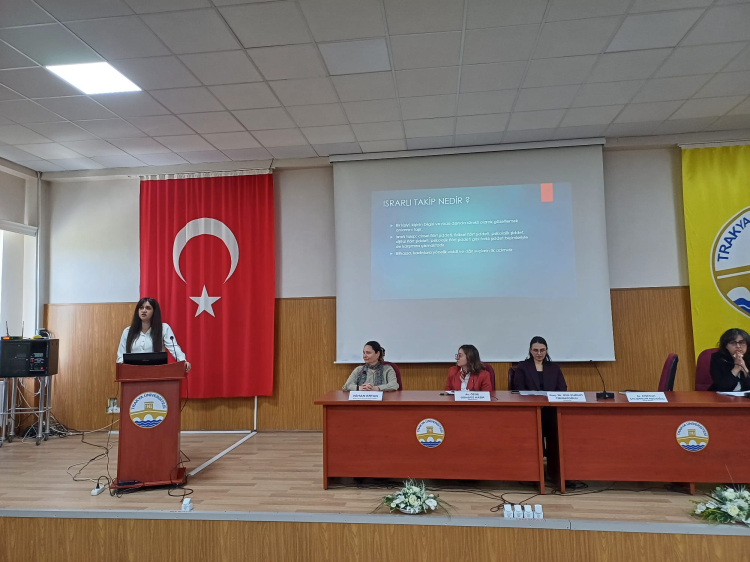 Panelde söz alan Edirne Barosu Avukatı Ayşenur Çalışanlar Aşılıoğlu ise ısrarlı takip konusuna dikkat çekti. Aşılıoğlu, kadının istemediği halde yapılan birçok davranışın ısrarlı takip kapsamında değerlendirilebileceğini belirterek “Kadının istemeden yapılan hemen her türlü eylem ısrarlı takip sebebidir ve 2022 yılından beri yasalarca ısrarlı takip bir suçtur. Kadının haberi olmadan iş yerine gelmek, çiçek göndermek, evinin ya da kendisinin etrafında sürekli dolaşmak hatta atılan bir mesaj bile ısrarlı takibe girebilir. Olası dava durumları için alınan hediyelerin ve mesajların delil olarak saklanması gerekir” diye konuştu.