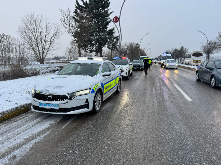 Edirne’de gece saatlerinden itibaren etkisini artıran karlı ve soğuk hava, karayollarında buzlanmaya neden oldu. Sabah saatlerinde D-100 karayolu üzerindeki Olin Kavşağı’ndan Trakya Üniversitesi Tıp Fakültesi istikametine giden güzergahta zincirleme trafik kazası meydana geldi.
