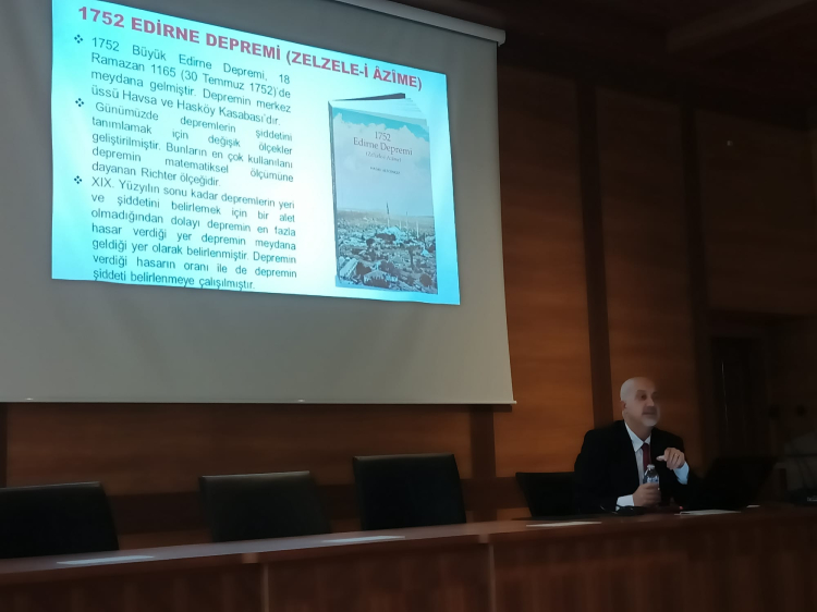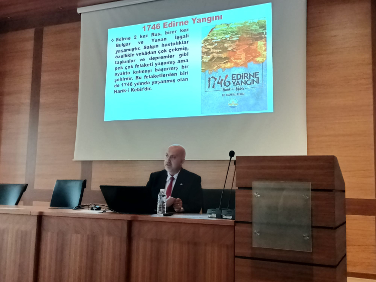 Akademisyenlerin ve öğrencilerin katıldığı konferansta Cengiz, Edirne’de 1746 yılında yaşanan yangın ve 1752 yılında meydana gelen depremde ortaya çıkan hasarı açıkladı.