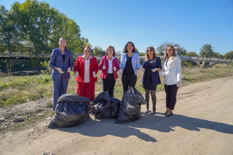 Kadın muhtarlar, topuklu ayakkabı ve takım elbiseyle nehir kenarındaki çöpleri topladı.