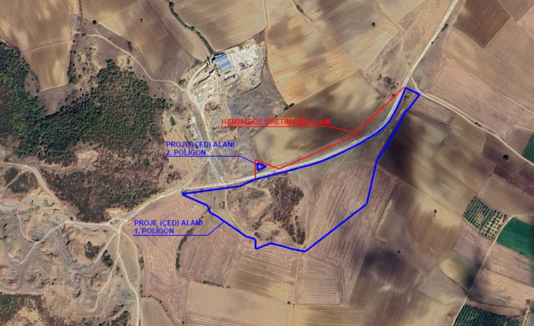 Projenin tanıtım dosyasına göre; 6,7 hektarlık bir alanı kaplayan II-A grubu Hammadde Üretim İzin Alanı’nın 5,8209 hektarlık kısmında projenin planlandığı ve öncelikle 2,50 hektarlık alan için Maden ve Petrol İşleri Genel Müdürlüğü’nden II-A grubu Hammadde Üretim İzin Belgesi alındığına yer verildi.
