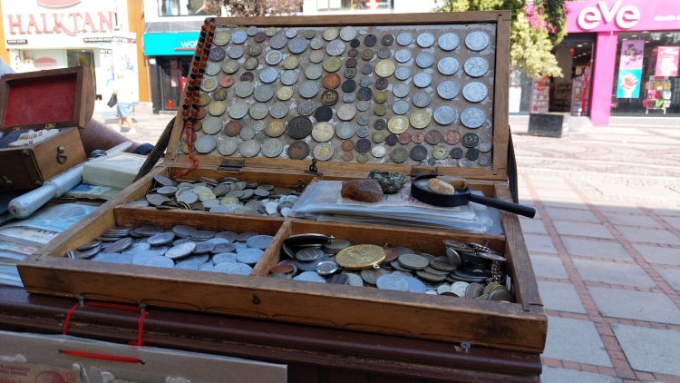 Edirne’de çocuk yaştan itibaren topladığı paraları koleksiyon haline getiren Aziz Alpan, topladığı paraları Saraçlar Caddesi’nde sergiliyor.