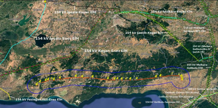 Projenin nihai ÇED raporuna göre; iletim hattı projesi toplam 41,574 kilometre uzunluğunda olacak ve Keşan’dan Gelibolu’ya bağlanarak enterkonnekte sisteme girişi sağlanacak. Direklerin isabet ettiği alanlarda yoğun olmak üzere, güzergâhın sağından ve solundan 25 metre olmak üzere toplam 50 metre genişliğindeki koridorda inşaat çalışmaları sürdürülecek. Direklerin dikileceği alanlar dışında kalan yerlerin arazi yapısı geçici olarak değişecek, tesis çalışmaları tamamlandıktan sonra arazi eski haline getirilecektir. Hat işletmeye alındıktan sonra tel altlarında tarım aktiviteleri devam ettirilebilecek. Direklerin isabet ettiği alanlar kamulaştırılacak, tel altları için ise irtifak hakkı tesis edilecek.