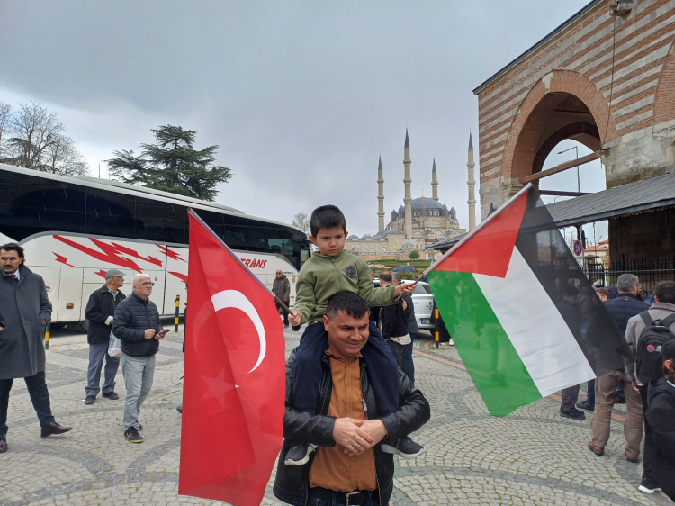 Edirne’de Cuma namazı çıkışında Eski Camii önünde bir araya gelen Edirne Filistin’e Destek Platformu üyeleri, Gazze’de yaşanan olaylara ilişkin basın açıklaması gerçekleştirdi.