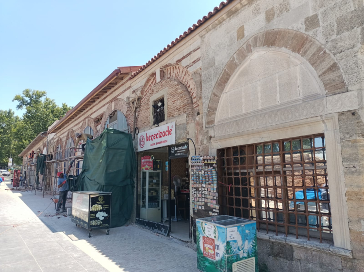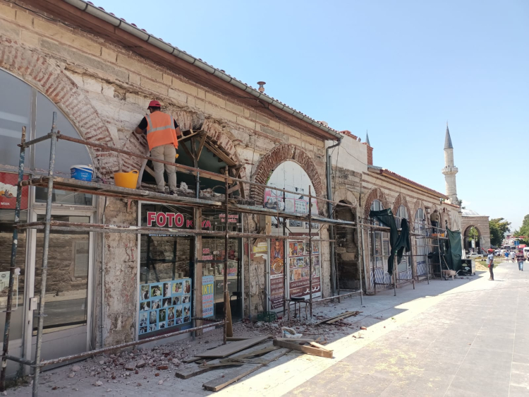Edirne'de Selimiye Camii meydanında bulunan Havlucular Hanı ve Mezit Bey Hamamı cephe sağlıklaştırma projesinin 2'nci etap çalışmaları devam ediyor.