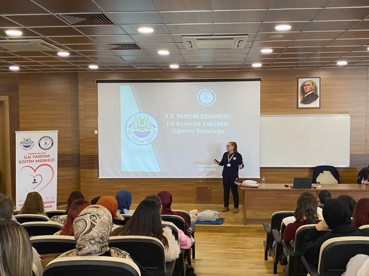 Edirne’de, Edirne Valiliği İlk Yardım Eğitim Merkezi ile Trakya Üniversitesi Eczacılık Öğrencileri Birliği işbirliğiyle üniversite öğrencilerine yönelik “İlk Yardım Farkındalık Eğitimi” düzenlendi. Trakya Üniversitesi Eczacılık Fakültesi Gazi Mustafa Kemal Atatürk Konferans Salonu’nda gerçekleşen etkinlikte, ilk yardım eğitmenleri Ayten Ülgü Sünetçiler ve Sibel Taylan tarafından ilk yardımın hayati önemi vurgulanırken, katılımcılar temel ilk yardım konuları hakkında bilgilendirildi.