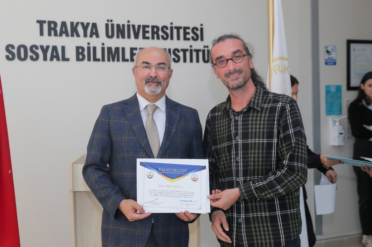 Trakya Üniversitesi Sosyal Bilimler Enstitüsü ile Edirne Ticaret ve Sanayi Odası (ETSO) arasında 2024 yılında imzalanan iş birliği protokolü kapsamında, “Edirne” konulu tezler üreten Üniversitemiz öğrencileri ödüllendirildi. Kente dair akademik çalışmaları teşvik etmeyi amaçlayan protokol çerçevesinde verilen ödüller, Sosyal Bilimler Enstitüsü Prof. Dr. Necmettin Hacıeminoğlu Toplantı Salonu’nda düzenlenen törenle sahiplerini buldu.