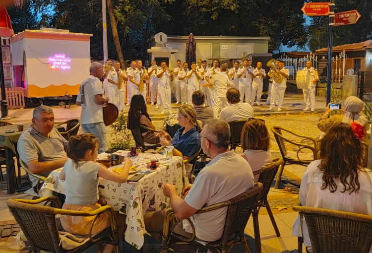 Kafeteryalarda bulunan vatandaşlar kimi zaman alkış tutarak, kimi zaman oynayarak bando ekibine eşlik etti.