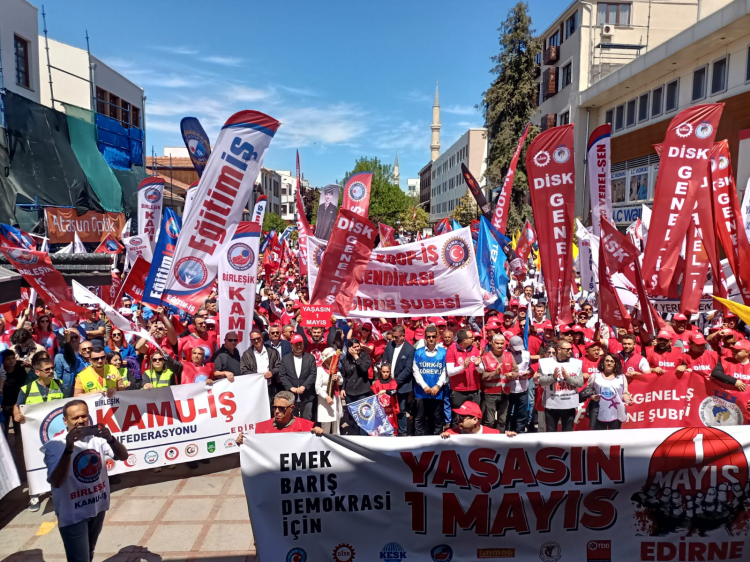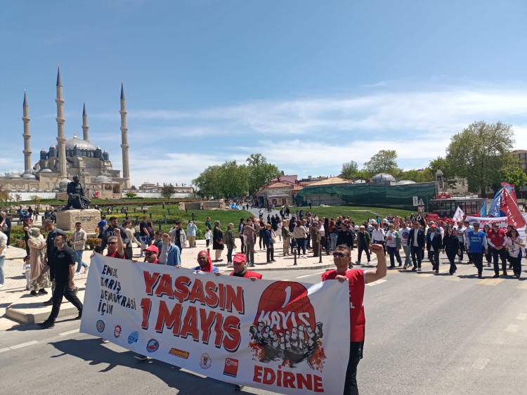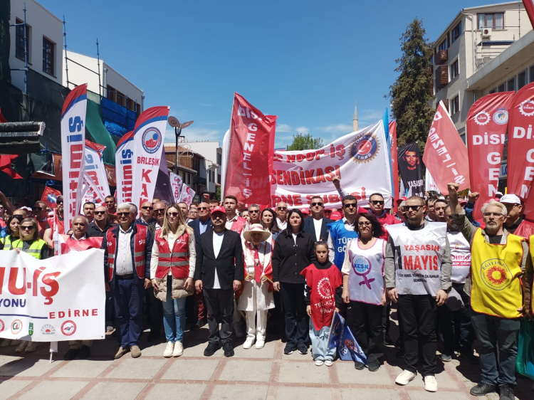 Edirne’de 1 Mayıs Emek ve Dayanışma Günü kutlandı. Edirne ve çevresindeki şehirlerden kutlamaya katılan sendikalar, siyasi partiler, odalar ve sivil toplum örgütleri, Şükrüpaşa İlkokulu önünde kortej oluştururken; Atatürk Bulvarı üzerinden Saraçlar Caddesi’ne yürüdü.