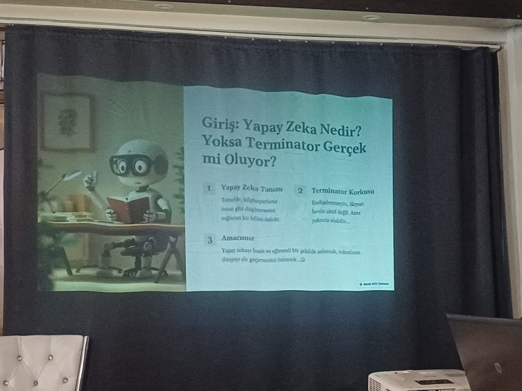 Sunumda yapay zekanın terminatöre benzetilmesi, insanlığın sonunu getireceği iddialarından bahsederek mizahi bir giriş yapan Uçar, “Yapay zeka, temelde bilgisayarların insan gibi düşünmesini sağlayan bilim dalıdır. Yapay zeka için şu an için amacımız, basit ve eğlenceli bir şekilde anlamak ve robotların dünyayı ele geçirmesini önlemek” dedi.