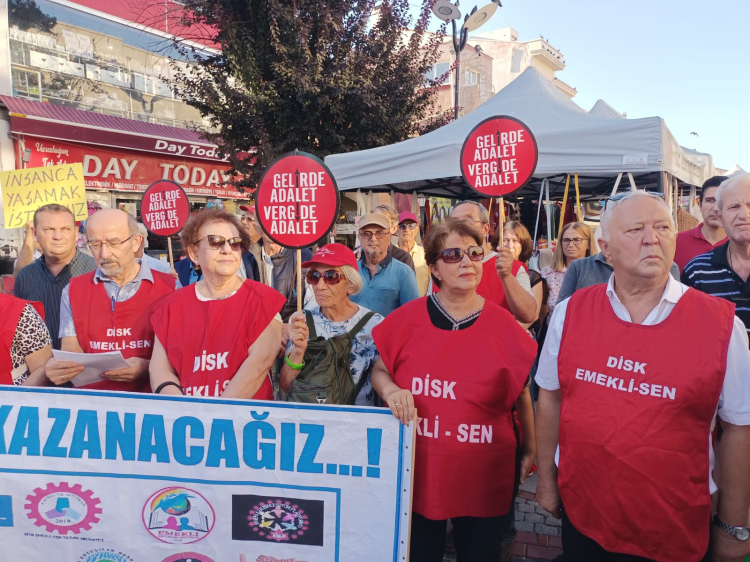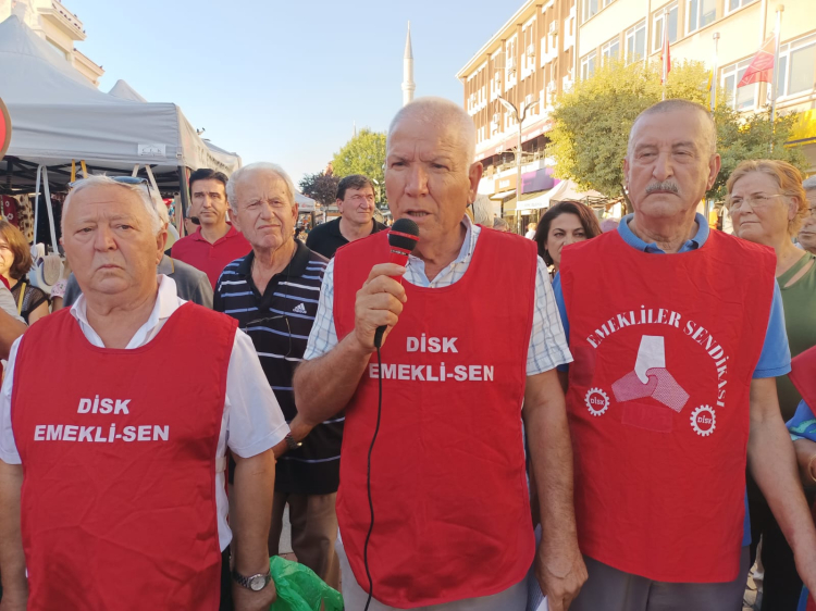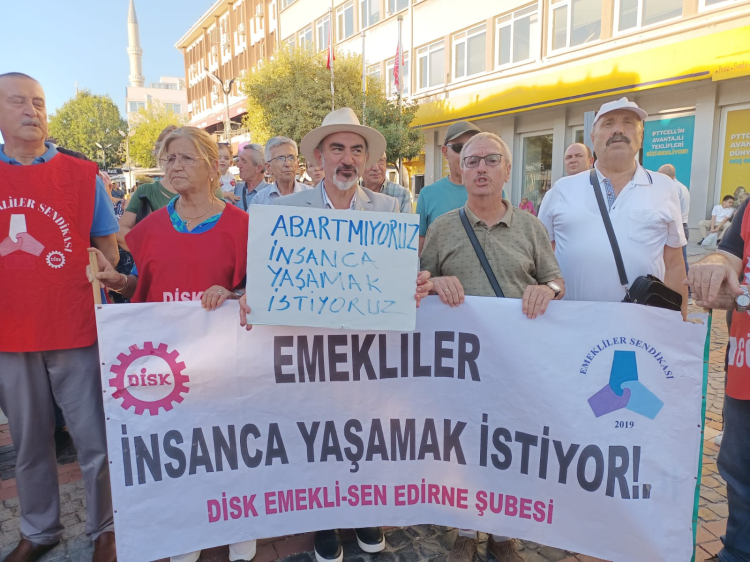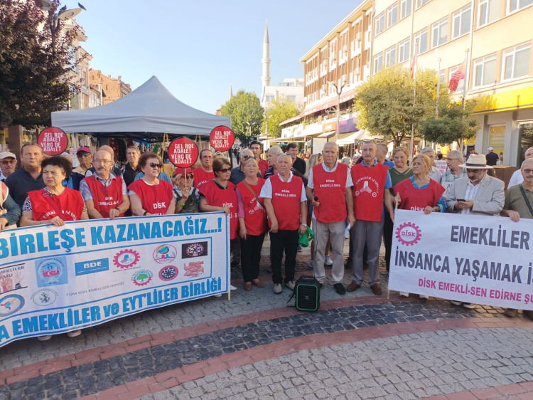 DİSK Emekli-Sen Edirne Şube Başkanı Sait Dayıoğlu, ekonominin faturasının emeklilere ve EYT’lilere ödetilmesine izin vermeyeceklerini söylerken; “Yönetemediğiniz ekonominin faturasını mecliste tartışılan emeklilik yasa tasarısı ile sefalete mahkûm ettiğiniz emeklilerin cebinden çaldığınız paralarla emeklilere ve EYT’lilere ödetmenize izin vermeyeceğiz. İMF’siz İMF programlarını uygulayan iktidar, ‘Emeklilerimizi enflasyona ezdirmedik, ezdirmeyeceğiz, ülkemiz emekli aylıkları bakımından gelişmekte olan ülkeler arasında ilk sıralarda yer almaktadır’ diyor. Sayın Şimşek’e hatırlatmak istiyoruz; siz iktidara geldiğinizde emekli aylıkları asgari ücretin 1,5 katıydı. Bugün ise asgari ücretin sadece yüzde 59’udur. Yani emeklinin cebinden yüzde 91 çaldınız. Lüksemburg’da 2 bin 734 euro, İzlanda’da 2 bin 513 euro, Norveç’te 2 bin 448 euro, bizi kıskanan Almanya’da bin 552 euro, Hollanda’da 2 bin 3 euro, yanı başımızdaki Yunanistan’da bin 26 euro emekliler maaş alırken; şükürler olsun ki enflasyona ezdirmediğiniz emeklilere sadece 284 euro karşılığı emekli aylığı veriyorsunuz. 44 OECD ülkesi arasında sondan dördüncü olan Türkiye, emekli aylıkları bakımından 37 ülke sıralamasında sondan üçüncü sırada. Arjantin ve Tayland olmasaydı sondan birinci sırada olacaktı” ifadelerini kullandı.