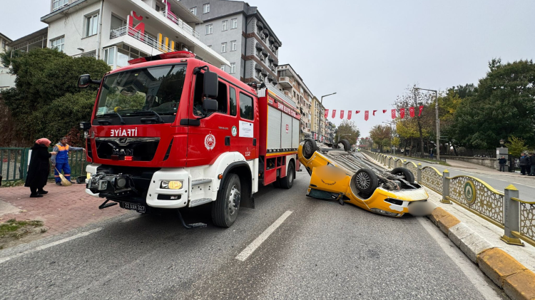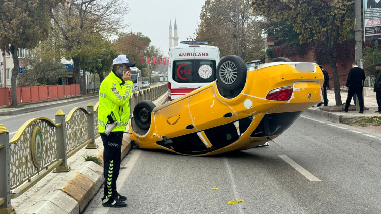 Edirne’de Ayşekadın istikametinden çarşı istikametine seyir halinde olan Vezaattin B.’nin kullandığı 22 T 04** plakalı ticari taksi, Bulgaristan Başkonsolosluğu önünde kaldırıma çarparak ters devrildi. Metrelerce sürüklenen araçta bulunan taksi sürücüsü emniyet kemerini kullanması sayesinde kazadan yara almadan kurtuldu.