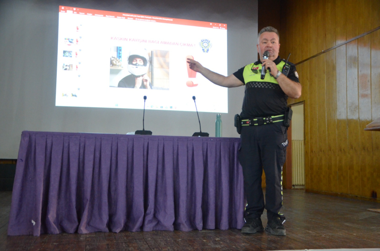 Edirne İl Emniyet Müdürlüğü Trafik Tescil ve Denetleme Şube Müdürlüğü tarafından Halk Eğitimi Merkezinde yapılan eğitim programında motosiklet sürücülerine trafikte nasıl daha güvenli bir şekilde seyir edebilecekleri konusunda önemli ipuçları verdi. Özellikle hız limitlerine uyma, trafik kurallarına riayet etme ve sürüş sırasında dikkatli olmanın önemi vurgulandı.