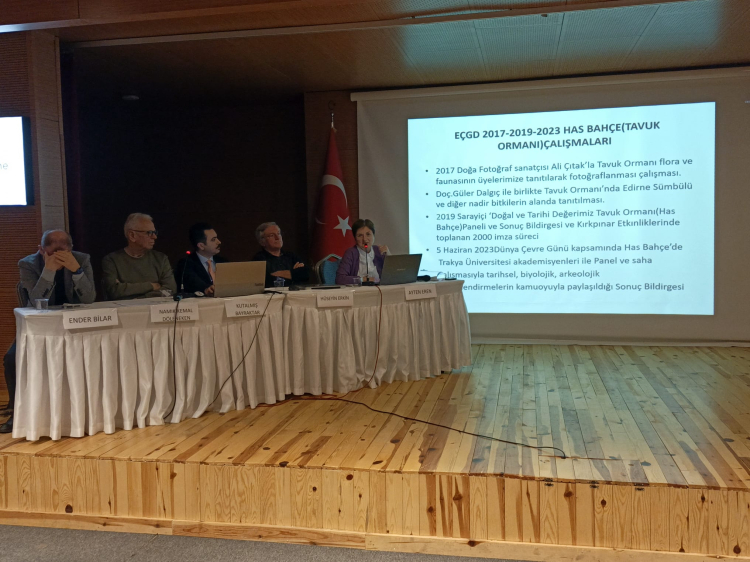 EÇGD’nin 2014 yılından başlayarak Tavuk Ormanı’nı (Has Bahçe) çalıştığını söyleyen Eren; “2014’ten sonra bu bölgede Trakya Üniversitesi hocalarımız ile birlikte kaçak ağaç kesimleri, Edirne Sümbülü’nün değerinin anlaşılamaması, saray ve bütünlüğünün bozulması konularında toplantılar yaptık. Bu bölgenin değerinin ortaya çıkarılmasını istedik. Bu bölgede Kırkpınar Stadyumu’nun da bu bütünlüğü bozduğunun üzerine bir çalışmaları var. 2017’de bir panel düzenledik ve sonuçlarını valilik ve belediye ile paylaştık” sözlerine yer verdi.