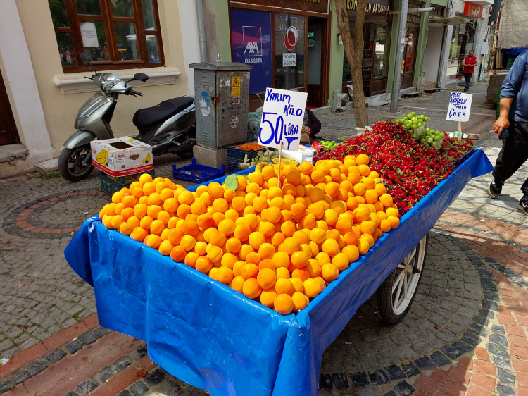 Yaz mevsiminin gelmesiyle mevsim meyveleri Edirne’deki tezgahlarda yer bulmaya başladı. Edirne’deki Balıkpazarı Caddesi’nde satış yapan seyyar satıcılar, fiyatların yüksek olması dolayısıyla ürünlerin etiketlendirilmesini yarım kilo üzerinden yapıyorlar.