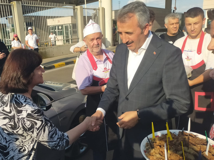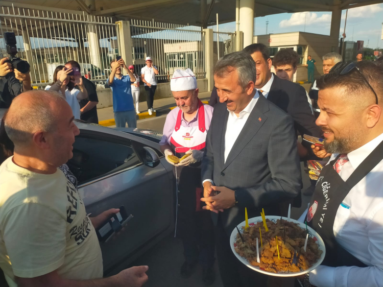 Halk oyunu gösterilerinin ardından giriş yapan gurbetçilere Edirne'yi Tanıtma ve Tava Ciğer Kalite Kontrol Derneği Başkanı Uğurcan Imrak tava ciğer, şekerlemeci Arif Meriç badem ezmesi ikram etti.