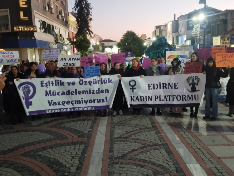 Edirne kadın platformu üyeleri, 25 Kasım Kadına Yönelik Şiddete Karşı Uluslararası Mücadele ve Dayanışma Günü dolayısıyla yürüyüş yaptılar. Eski Cami önünde toplanan platform üyesi kadınlar, Çilingirler Caddesi’nden geçerek Saraçlar Caddesi’ndeki Postane önünde basın açıklaması düzenlediler.
