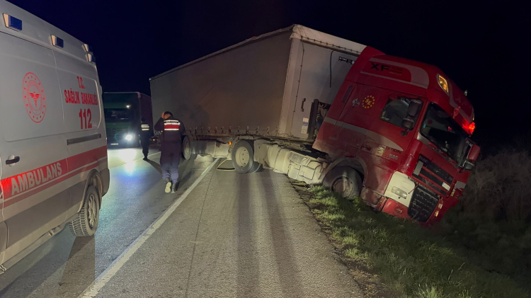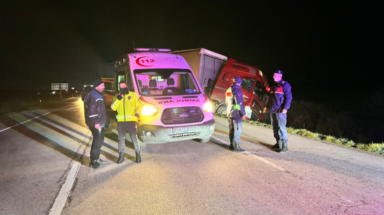 Çevredeki vatandaşların ihbarı üzerine olay yerine, jandarma, polis, itfaiye ve sağlık ekibi sevk edildi. Şarampolün kenarında eğik vaziyette duran TIR’da mahsur kalma riskine karşı ekipler geniş güvenlik önlemi aldı.