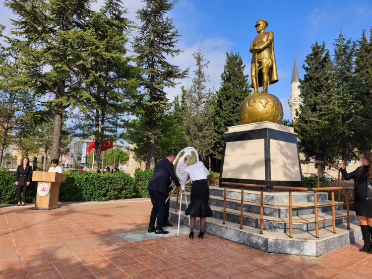Tören, Müdür Fidan’ın Atatürk Anıtı’na çelenk sunmasıyla başladı. Ardından Türkiye Cumhuriyeti’nin kurucusu Gazi Mustafa Kemal Atatürk, silah arkadaşları ve tüm şehitler anısına bir dakikalık saygı duruşunda bulunuldu ve İstiklal Marşı okundu.
