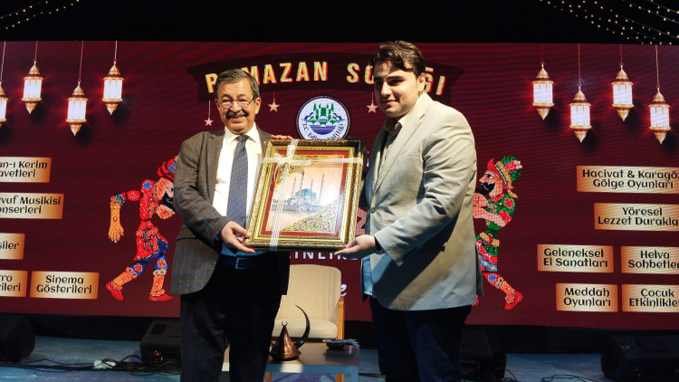 Söyleşinin sonunda, Hz. Aişe’nin Hz. Muhammed’e yazdığı şiiri okuyan Hayati İnanç’a Edirne Vali Yardımcısı Batuhan Ciğerci Selimiye Camii tablosu hediye etti.