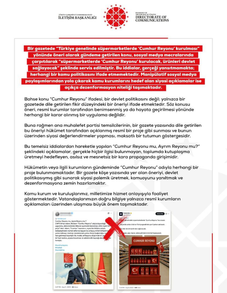 Dezenformasyonla Mücadele Merkezi'nden yapılan açıklamada şu ifadelere yer verildi: “Bir gazetede Türkiye genelinde süpermarketlerde 'Cumhur Reyonu' kurulması yönünde öneri olarak gündeme getirilen konu, sosyal medya mecralarında çarpıtılarak (süpermarketlerde 'Cumhur Reyonu' kurulacak, ürünleri devlet sağlayacak) şeklinde servis edilmiştir. Bu iddialar, gerçeği yansıtmamakta; herhangi bir kamu politikasını ifade etmemektedir. Manipülatif sosyal medya paylaşımlarından yola çıkarak kamu kurumlarını hedef alan siyasi açıklamalar ise açıkça dezenformasyon niteliği taşımaktadır. Bahse konu "Cumhur Reyonu" ifadesi, bir devlet politikasını değil; yalnızca bir gazetede dile getirilen fikir düzeyindeki bir öneriyi ifade etmektedir. Söz konusu öneri, resmi kurumlar tarafından benimsenmiş ya da hayata geçirilmesi yönünde herhangi bir karar alınmış bir uygulama değildir. Buna rağmen ana muhalefet partisi temsilcilerinin, bir gazete yazısında dile getirilen bu öneriyi hükümet tarafından açıklanmış resmi bir proje gibi sunması ve bunun üzerinden siyasi değerlendirmeler yapması, maksatlı bir tutumun göstergesidir. Bu temelsiz iddialardan hareketle yapılan "Cumhur Reyonu mu, Ayrım Reyonu mu?" şeklindeki açıklamalar, gerçekle hiçbir ilgisi bulunmayan, toplumda kutuplaşma üretmeyi hedefleyen, asılsız ve mesnetsiz bir kara propaganda girişimidir. Hükümetin veya ilgili kurumların gündeminde "Cumhur Reyonu" adıyla herhangi bir proje bulunmamaktadır. Bir gazete köşe yazısında yer alan öneriyi, devlet politikasıymış gibi sunarak siyasi polemik üretmek, kamuoyunu yanıltmak ve dezenformasyona zemin hazırlamaktır. Kamu kurum ve kuruluşlarımız, milletimize hizmet anlayışıyla faaliyet göstermektedir. Vatandaşlarımızın doğru bilgiye yalnızca resmi kurumların açıklamaları üzerinden ulaşması büyük önem taşımaktadır.”