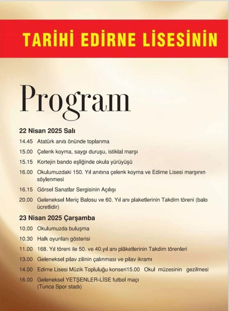 Edirne Lisesinden Yetişenler Derneği Edirne Şube Başkanı Tunç Üçer, “Her yıl gerçekleştirdiğimiz etkinliğimiz bu yılda kaldığı yerden devam edecek. 22 Nisan Salı günü Atatürk Anıtı’na çelenk bırakarak programımız başlayacak, okul içerisinde ki 150. Yıl Anıtı’na çelenk koyma töreni ile devam edecek. 22 Nisan Salı akşamı da gerçekleştirdiğimiz Meriç Balosu’nda 60. Yıl anı plaketleri takdim edilecek. 23 Nisan günü okulda devam edecek programımızda 168. Yıl Törenimiz ile 40. ve 50. Yılanı plaketleri takdim edilecek. Geleneksel pilav zilinin çalınması ile birlikte pilav ikramımız gerçekleşecek ve program yetişenlerin, öğrenciler ile yapacağı maç ile son bulacak” sözleri ile programı aktardı.