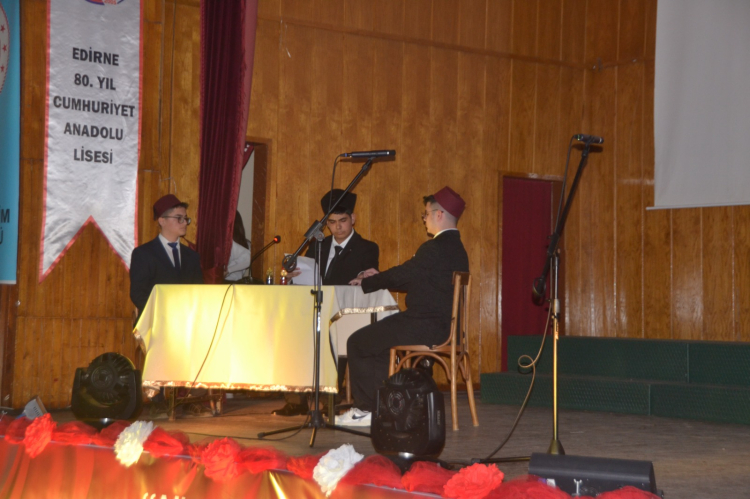 Edirne Halk Eğitim Merkezi’nde 80’inci Yıl Cumhuriyet Anadolu Lisesi tarafından organize edilen İstiklal Marşı’nın kabulünün 104’üncü yılı anma programı düzenlendi. Saygı duruşu ve İstiklal Marşı’nın okunmasıyla başlayan programda günün anlam ve önemine dair konuşan Edirne 80’inci Yıl Cumhuriyet Anadolu Lisesi Tarih Öğretmeni Ayşegül Değirmencioğlu 12 Mart’ın, milli mücadelenin zorlu günlerinde milletimizin milli birliğini ve beraberliğini temsil eden bir mirasın yıldönümü olduğunu belirterek; “Aynı zamanda bir milletin yeniden doğuşunun öyküsüdür. Bu öykünün en derin ve en anlamlı ifadesi de İstiklal Marşımızdır. Mehmet Akif Ersoy, İstiklal Marşımızı kurtuluş savaşımızın en zor günlerinde halkımız ve ordumuzun manevi desteğe en çok ihtiyaç duyduğu bir zamanda yazmıştır. Milli mücadelemizin ve ilim irfan geleneğimizin sembollerinden olan Mehmet Akif, ebedileşen eserleri, mücadeleci kişiliği, derin ilmi ve ahlakı ile aziz milletimizin gönlünde müstesna bir yer edinmiştir. Milletimize istiklal marşı gibi bir bağımsızlık beyannamesi kazandırmanın yanında Akif, yaşantısıyla, duruşuyla, Safahat gibi hala aşılamamış eseriyle gerçek bir İslam münevveridir” ifadelerini kullandı.