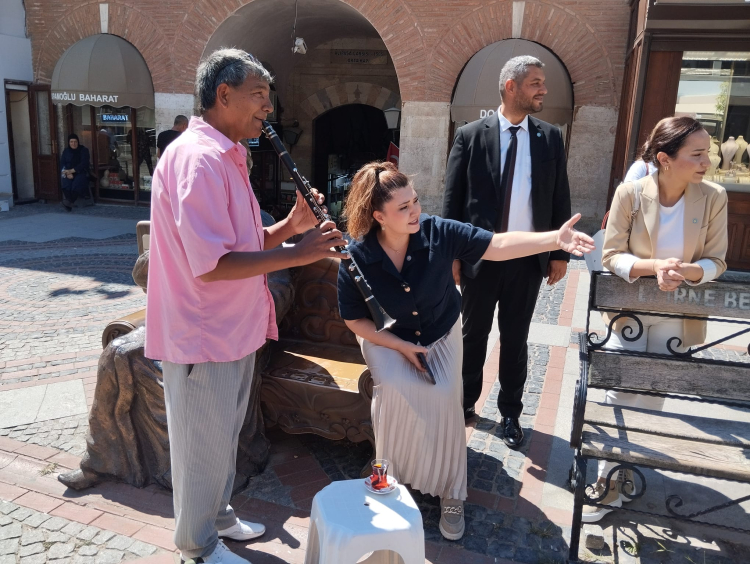 Ziyaretler sırasında caddede bulunan sokak sanatçısının yanına giden iyi parti heyeti, sanatçı Mehmet Gümüş’ten “Kırmızı gülün alı var” şarkısını istek yaptılar. Sanatçının klarnetiyle çaldığı şarkıyı dinleyen vekiller, eşlik de ettiler. Genel Başkan Yardımcısı Taşçı ve beraberindekiler şarkının bitmesi sonrası sokak sanatçısı Gümüş’e bahşiş de verdiler.