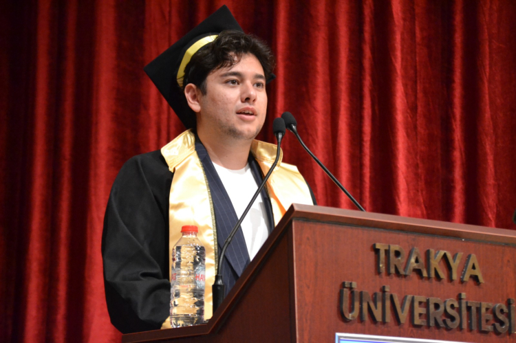 Törenin açılış konuşmasını fakülte birincisi Umut Şentürk yaptı. Şentürk’ün konuşması katılımcılardan yoğun alkış aldı. Şentürk, konuşmasında akademisyenlere ve ailelere emeklerinden dolayı teşekkür ederken; mezun olan öğrencilere de başarılar diledi. Konuşmasını Türkiye Cumhuriyeti’nin kurucusu Mustafa Kemal Atatürk’ün bir sözüyle tamamlayan Şentürk; “Bu kürsüdeki son sözlerimi, Ulu Önderimiz Mustafa Kemal Atatürk’ün sözleriyle tamamlamak istiyorum. ‘Umutsuz durumlar yoktur. Umutsuz insanlar vardır.’ Umudunuzu asla kaybetmeyin. Hayat bazen zorlayacak ama biz bu fakülteden mücadele etmeyi öğrenerek mezun olduk” dedi. Şentürk’ün konuşması ile salonda adeta alkış tufanı koptu. Törende ayrıca TÜ Rektör Yardımcısı Prof. Dr. Eylem Bayır ve Uygulamalı Bilimler Fakültesi Dekanı Prof. Dr. Gökhan Sönmezler de konuşma yaparak, hem akademisyenleri ve aileleri tebrik ettiler, hem de mezun olan öğrencilere başarı dileklerini ilettiler.