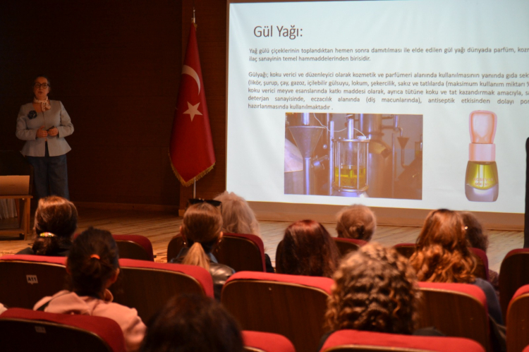 Edirne Belediyesi Atatürk Kültür Merkezi salonunda düzenlenen panelde Doç. Dr. Gedik, Edirne gülünün tarihi ve kullanım alanlarıyla ilgili sunum yaptı.