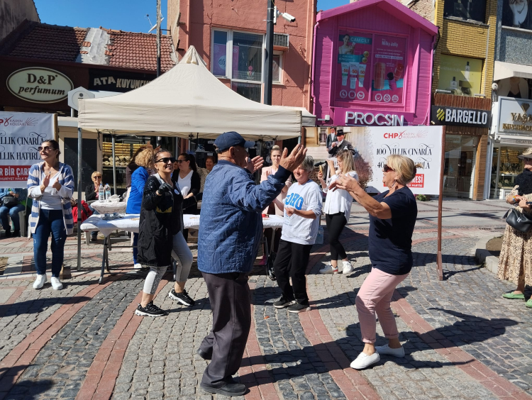 Edirne’de Cumhuriyet Halk Partisi (CHP) il ve merkez ilçe kadın kolları üyeleri dünya kahve gününü kutladılar. Dünya kahve günü için Saraçlar Caddesi’nde stant kuran kadınlar, vatandaşlara “100 yıllık çınarla, 40 yıllık hatırla” sloganı eşliğinde kahve ikramı yaptılar. Bu sırada yapılan müzik yayınında çalan oyun havaları eşliğinde programa katılan kadın kolları üyeleri göbek attılar. Kadınların oyununa caddeden geçen bazı vatandaşlar da eşlik etti.