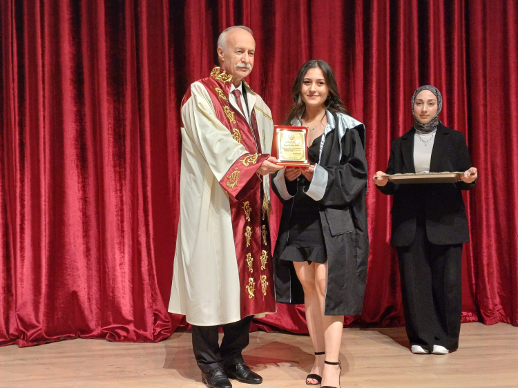 Törenin devamında, okul birincisi Kardelen Tuna, ikincisi Sıla Coşkun ve üçüncüsü Ecem Göksenin Kocabıyık sahneye davet edilerek, başarı belgeleri ve plaketlerini aldı. Belge takdimini Rektör Yardımcıları Prof. Dr. Mustafa Tan ve Prof. Dr. Eylem Bayır gerçekleştirdi.