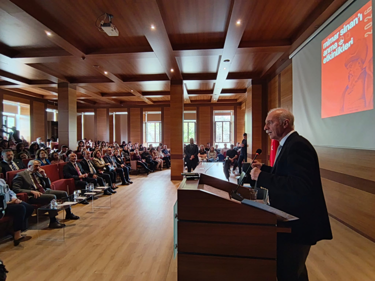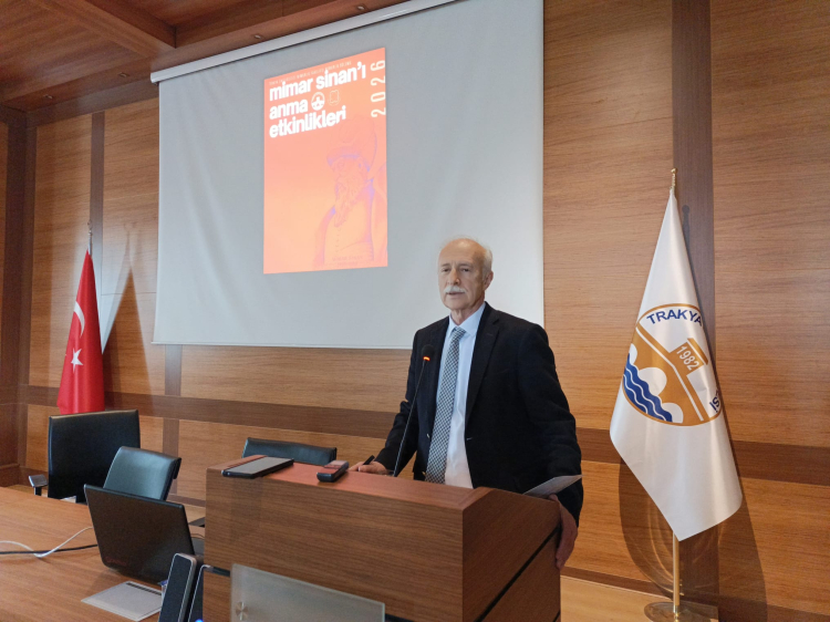 Trakya Üniversitesi (TÜ) Mimarlık Fakültesi Mimarlık Bölümü tarafından düzenlenen Mimar Sinan’ı anma etkinlikleri kapsamında TÜ Rektörü Prof. Dr. Mustafa Hatipler, Mimar Sinan, eserleri ve eserlerindeki sembolizm örnekleri ile ilgili sunum yaptı.